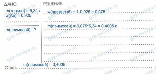 6. При химическом анализе старинного кольца массой 5,34 г было выяснено, что оно на 92,5% состоит из золота, остальное - примеси других месталлов. Рассчитайте массу примесей в кольце.