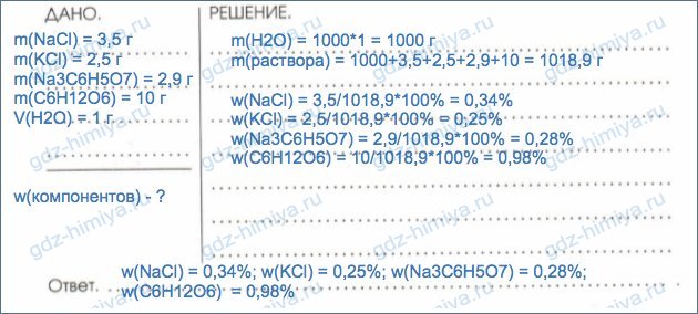 7. В аптеке продается порошок "Регидрон", который используют при обезвоживании организма. Один пакет порошка содержит 3б5 г хлорида натрияб 2б5 г хлорида калияб 2ю9 г цитрата натрия и 10 г глюкозыю Содержимле пакета растворяют в 1 л воды. Определите массовые доли всех компонентов порошка "Регидрон" в полученном растворе.