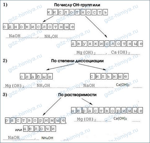 2. Вспомните классификацию оснований и распределите гидроксид натрия, гидроксид магния, гидроксид кальция, гидрат аммиака по соответствующим группам, вписав их формулы.