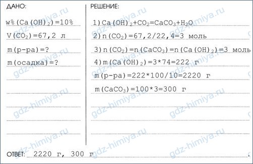 6. Вычислите массу (г) 10%-го раствора гидроксида кальция, необходимого для взаимодействия с 67,2 л углекислого газа (н. у.). Сколько граммов осадка образуется?