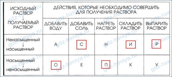 6. Установите соответствие между действием, которое нужно совершить для получения раствора, и типом раствора. Из букв, соответствующих правильным ответам, вы составите название раствора сахара в воде: сироп.