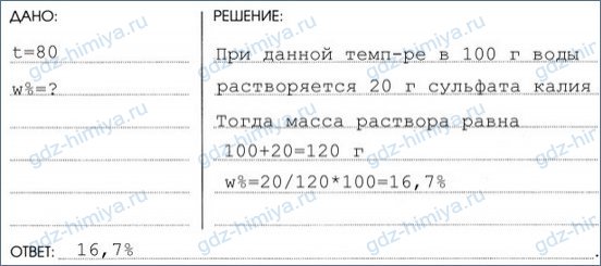 8. По графику (см. рис. 126 в учебнике) определите растворимость сульфата калия при 80 °С. Рассчитайте массовую долю соли в растворе, насыщенном при указанной температуре.