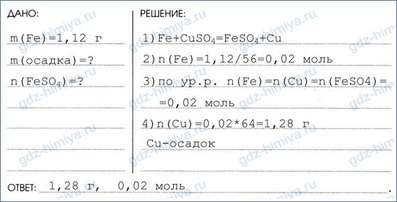 6. Железо массой 1,12 г полностью прореагировало с раствором сульфата меди (II). Найдите массу образовавшегося осадка меди. Какое количество вещества сульфата железа (III) при этом получилось?