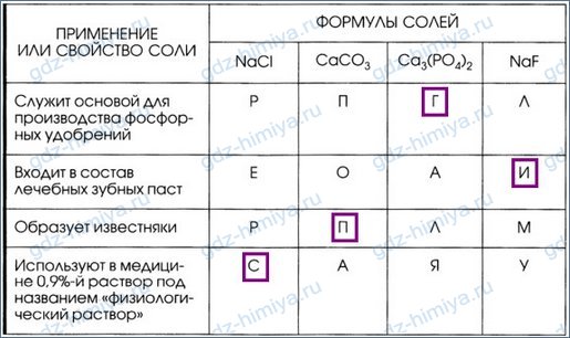 5. Установите соответствие между формулой соли и её применением или свойством. Из букв, указывающих правильный ответ, вы составите название одного из самых древних связующих материалов на основе сульфата кальция: гипс.