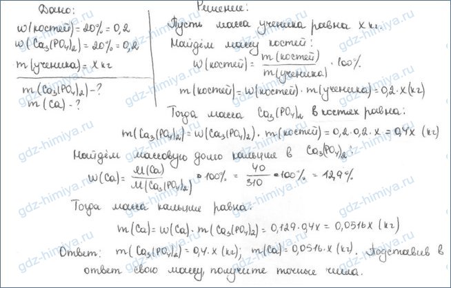 1. Массовая доля костей человека составляет 20% от общей массы организма. На долю фосфата кальция, входящего в состав костей, приходится также 20% от массы костей. Зная массу своего тела, рассчитайте, сколько килограммов фосфата кальция содержится в вашем организме. Сколько килограммов кальция содержится в нем?