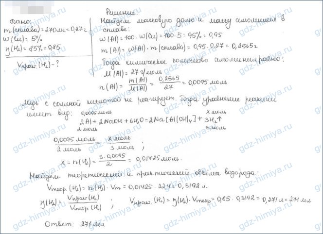 7. Вычислите объем водорода (н.у.), который может быть получен при растворении в едком натре 270 мг сплава алюминия, содержащего 5% меди. Выход водорода примите равным 85% от теоретически возможного.