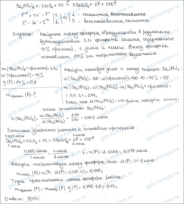 Рассмотрите окислительно-восстановительные процессы. Придумайте и решите задачу на определение массы фосфора при известном выходе его от теоретически возможного, в условии задачи укажите массу исходного фосфата кальция и долю примесей в нем.