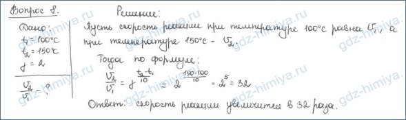 8. Химическую реакцию начали проводить при температуре 100 °С, затем подняли до 150 °С. Температурный коэффициент этой реакции равен 2. Во сколько раз возрастёт скорость химической реакции?